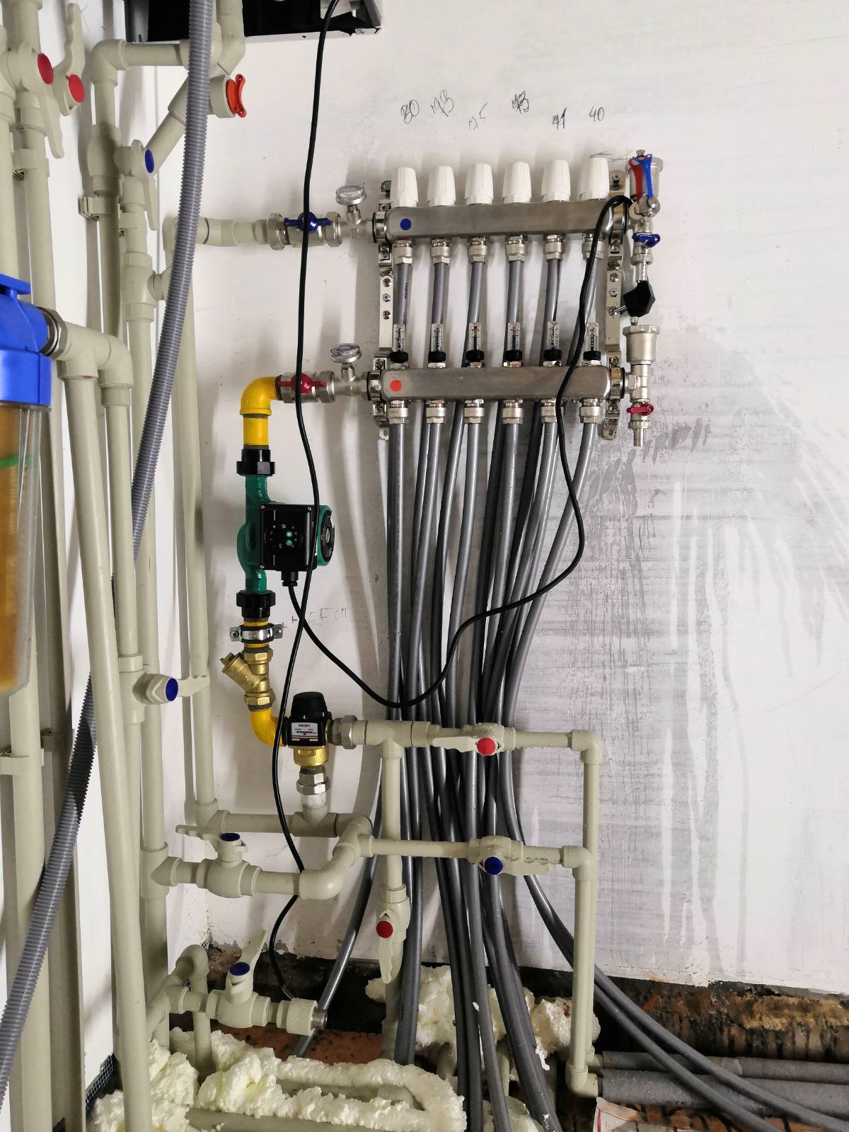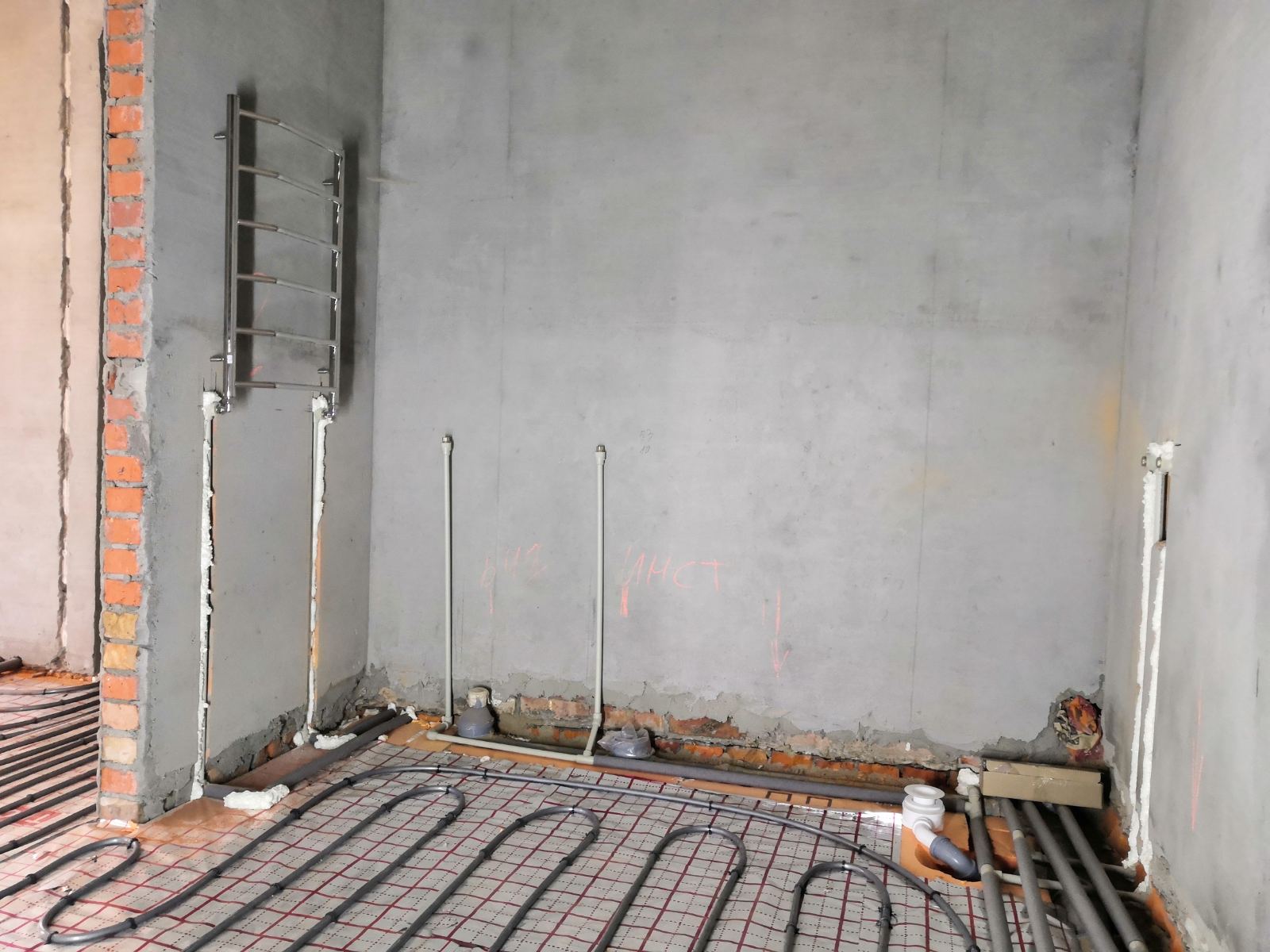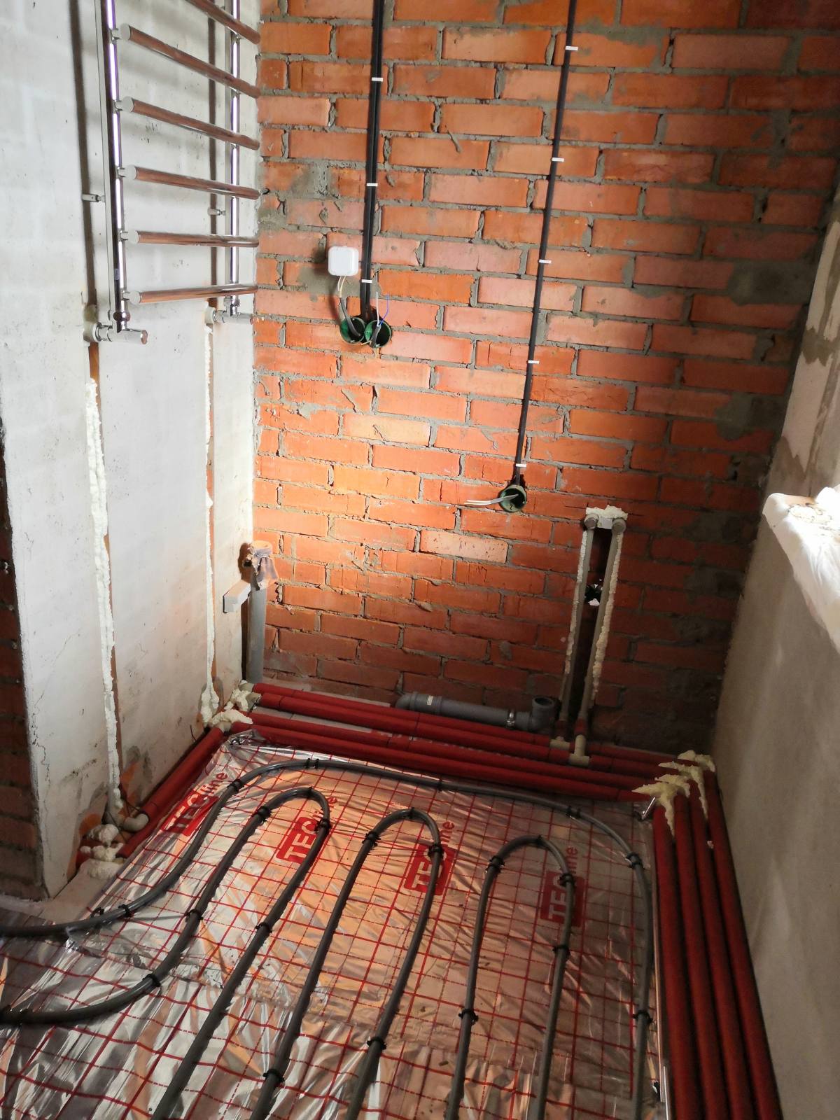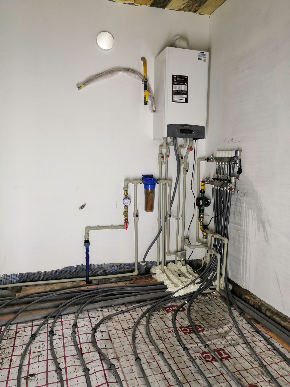Выполнен монтаж комбинированной системы отопления в количестве восьми точек радиаторов, раскладки 80 м2 теплого пола на базе конденсационного котла Ariston, установка полотенцесушителя. А также разводка системы водоснабжения и канализации в количестве семи точек потребления. Перенос счетчика холодного водоснабжения и установка фильтрующей колбы.