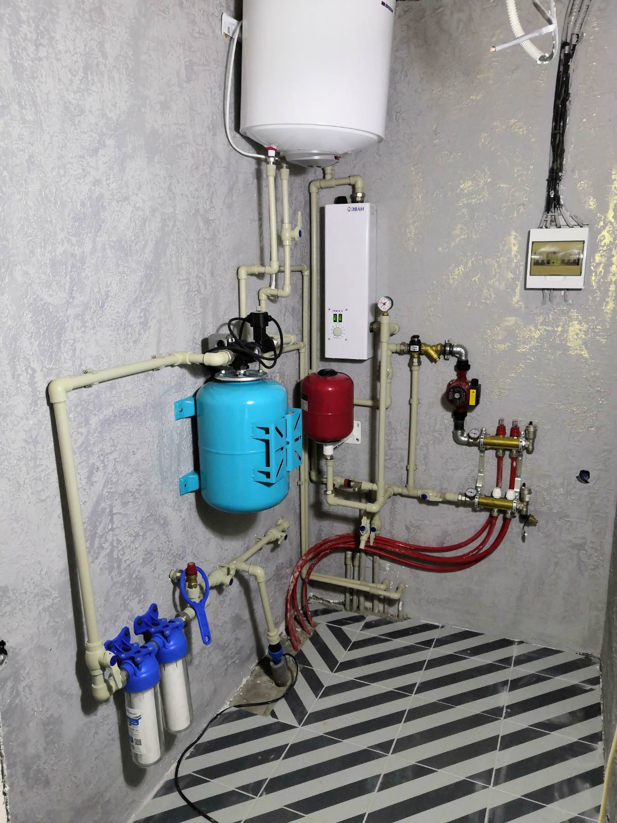 Монтаж электрокотла Эван Next 7 с обвязкой теплых полов и радиаторной сети. Монтаж погружного насоса в скважину и установка бетонных колец под кисон.